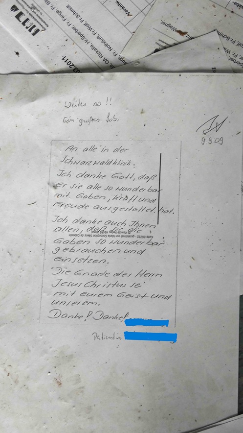 Darüber hinaus gab es noch das Privat Sanatorium für die Privatpatienten die wohl fast ausschließlich für Ehepaare gedacht waren. Anhand von vielen Rechnungen die dort noch rum gelegen haben war so ein Aufenthalt der in der Regel 14 Tage bis 3 Wochen dauerte ganz ordentlich und glich eher einem Hotel Aufenthalt als eine Kur.