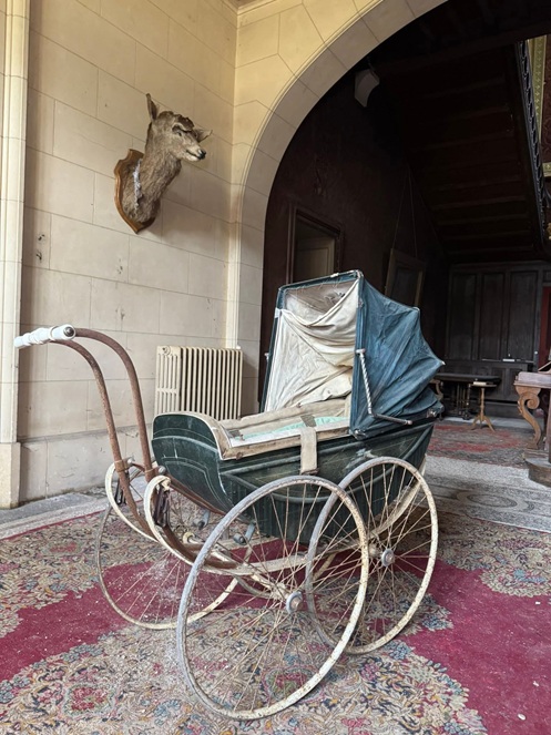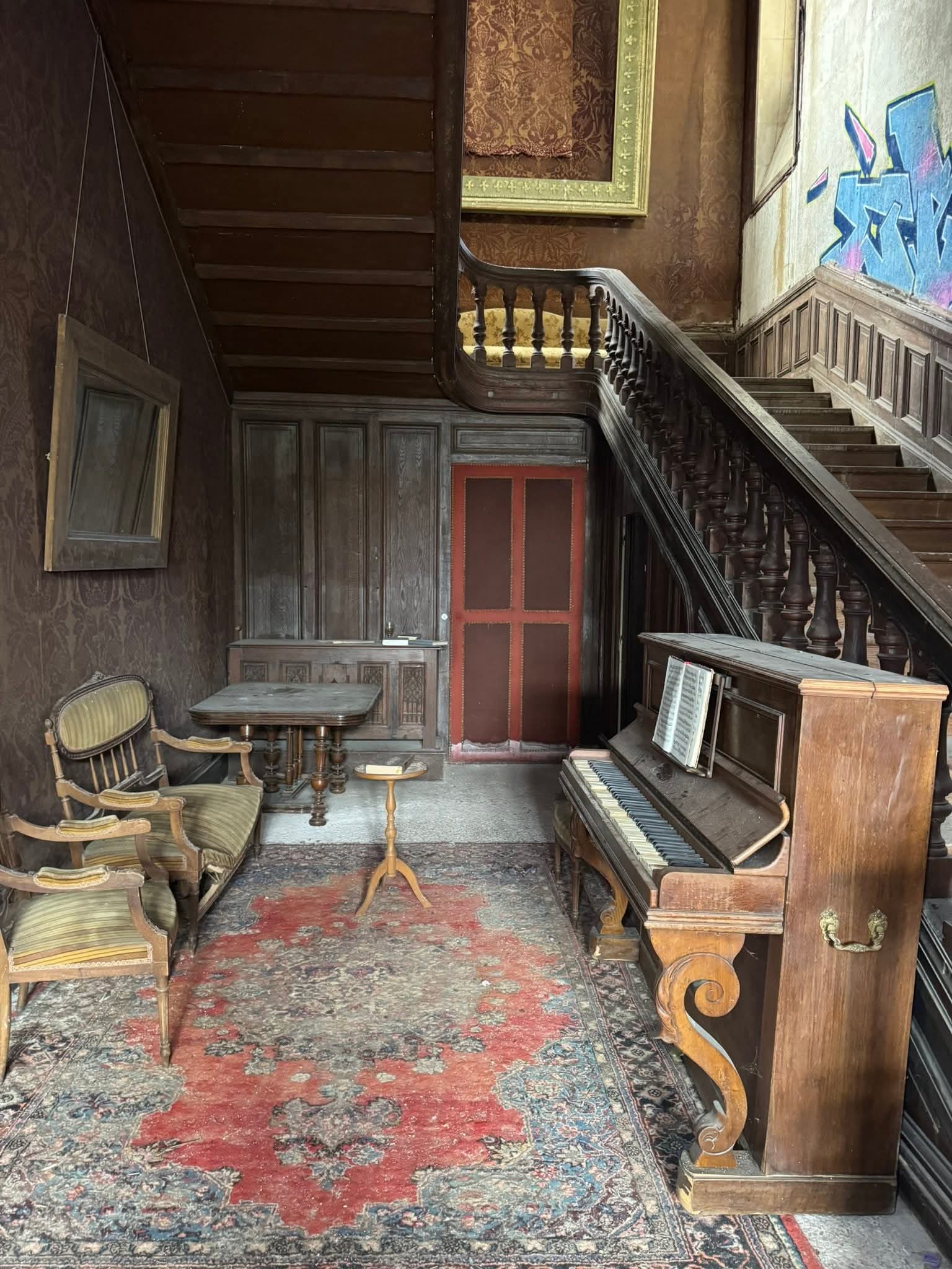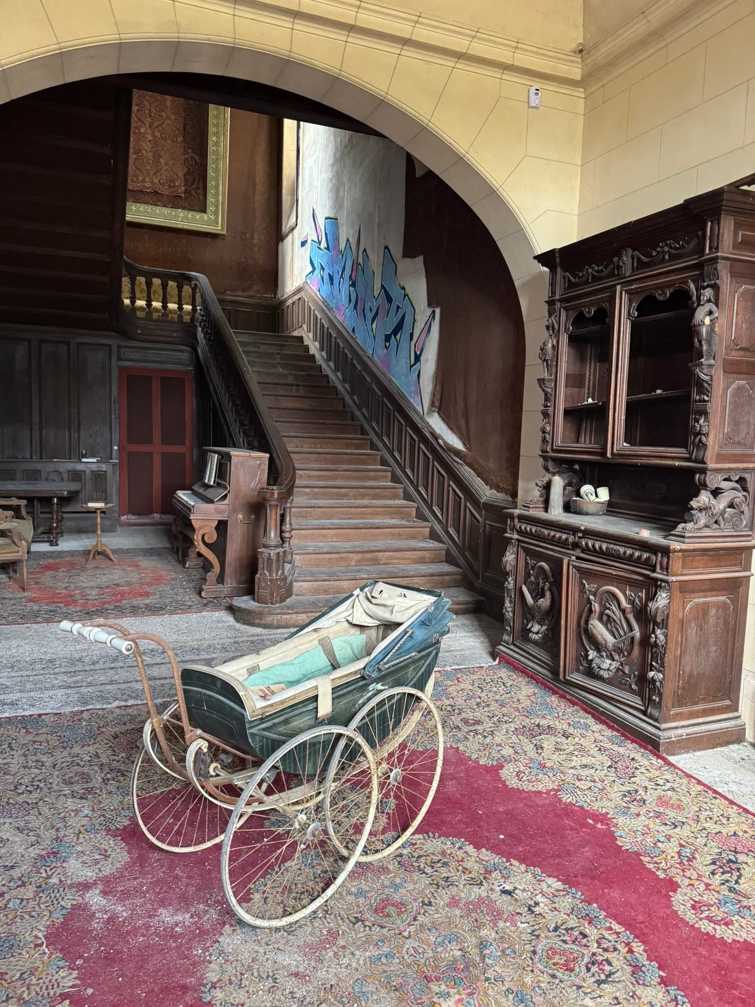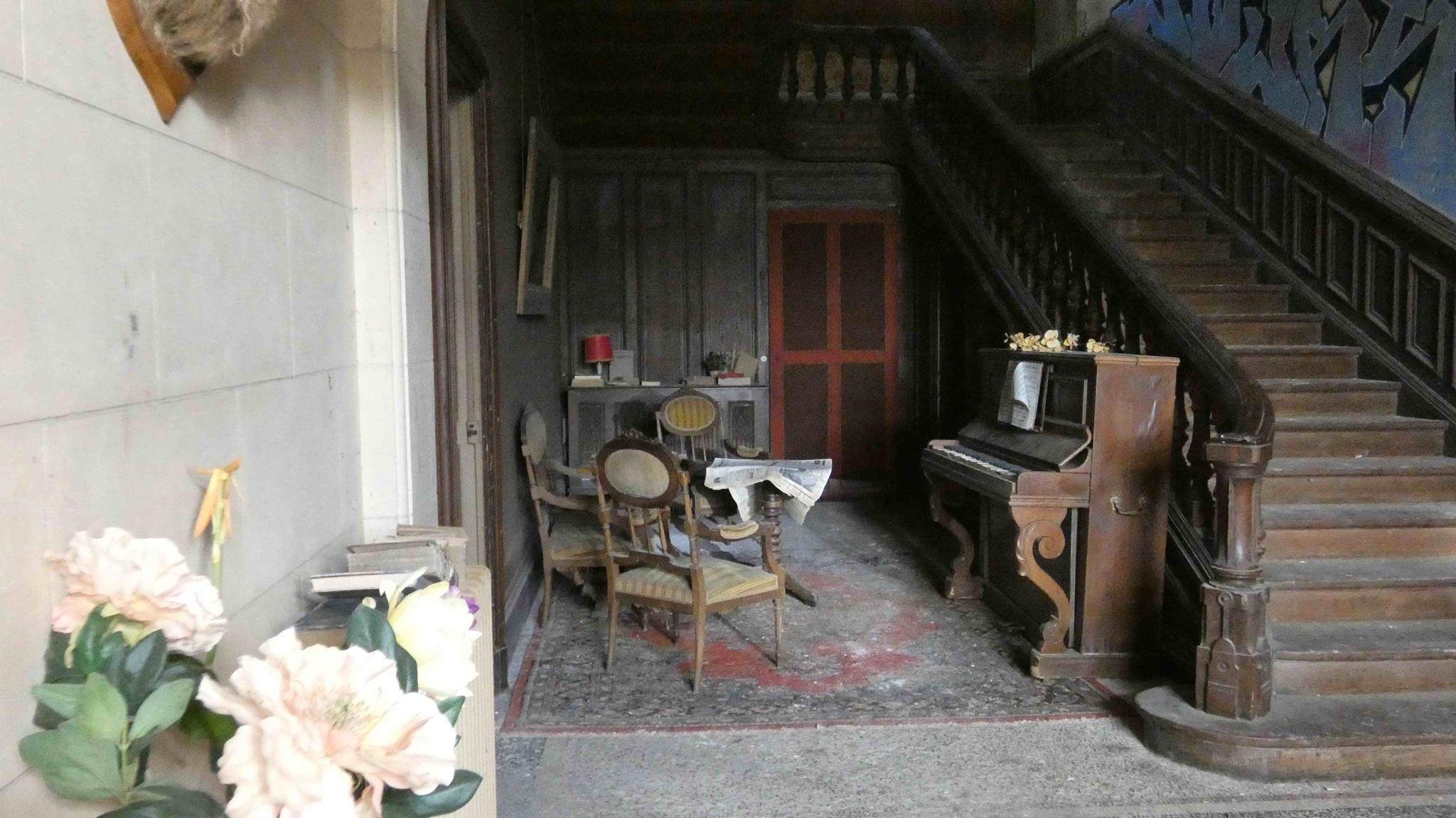 Die imposante Eingangshalle ist mit massivem Stein verkleidet und verfügt über einen beeindruckenden Mosaikboden, beherrscht von einer majestätischen Treppe aus massivem Eichenholz. Abgesehen von wenig Graffiti und einer zerrissener Tapete ist der Raum bemerkenswert gut erhalten. Es gibt kaum Vandalismus.