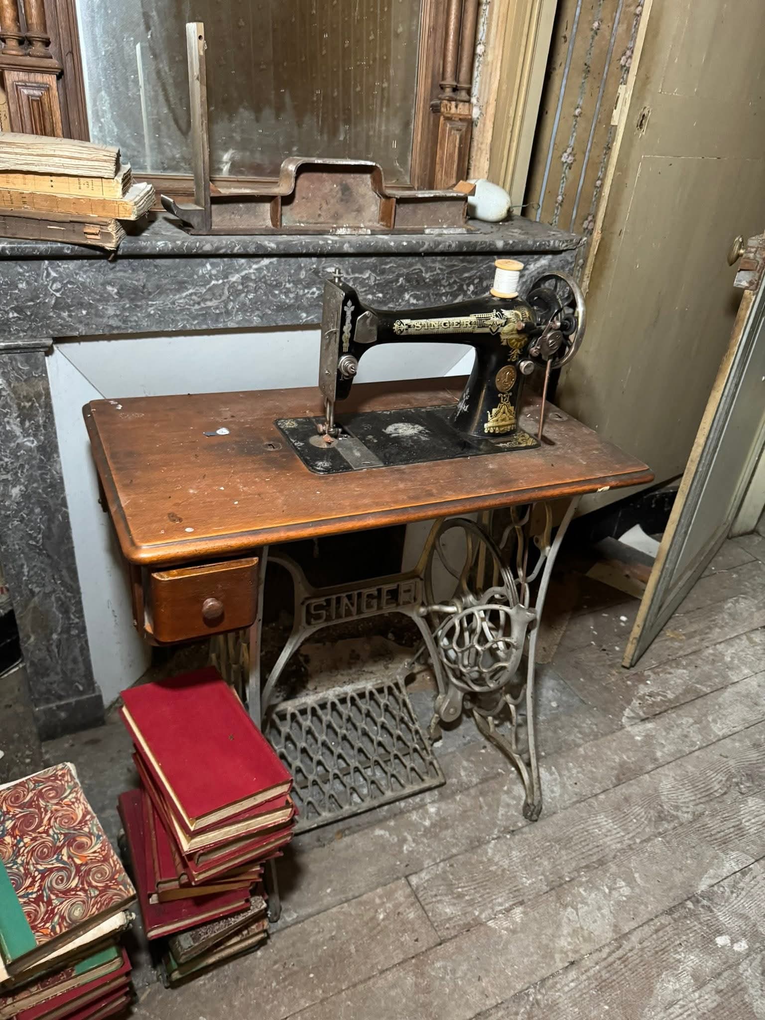 Der nächste Raum, den wir beteten, ist die Bibliothek. Rätselhafterweise stehen sechs antike Nähmaschinen zwischen den Bücherregalen und eine große Sammlung historischer Bücher.