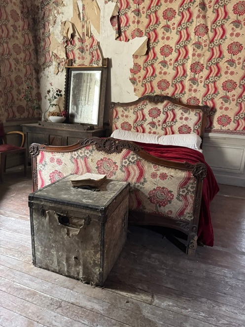 Ein Schlafzimmer mit einem Schlittenbett und einem einfachen Stuhl eingerichtet und einer Tapete, die aussieht wie Retro. Abgesehen von einigen kleinen kosmetischen Problemen ist der Raum in überraschend gutem Zustand.