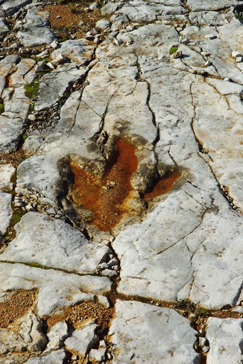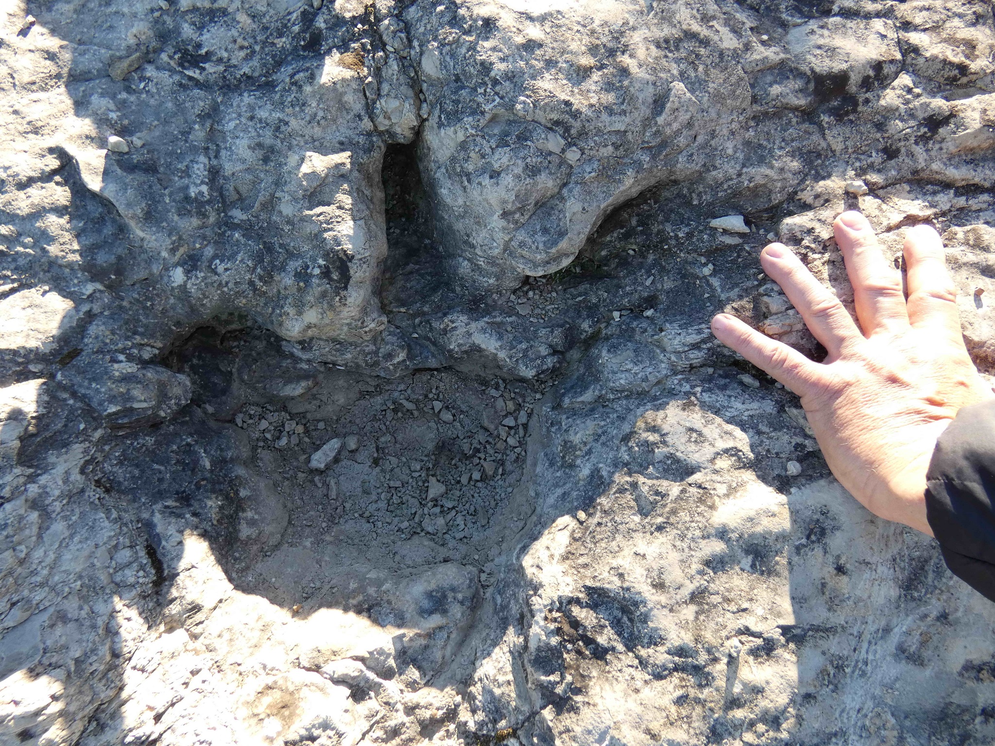 Wir wussten, dass es am Strand von Salgado 200 Millionen Jahre alte Fußabdrücke von Dinosauriern gibt. Wir haben eine Stunde lang gesucht. Auf den Steinplatten im Gebüsch haben wir einige Abdrücke gefunden.