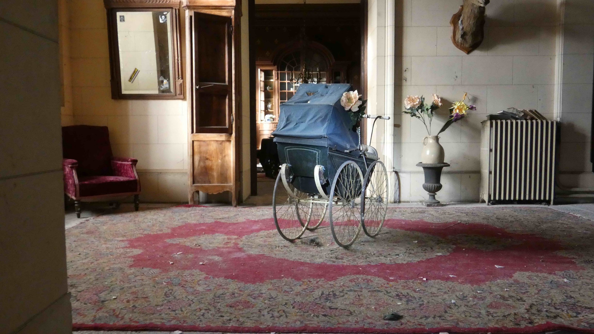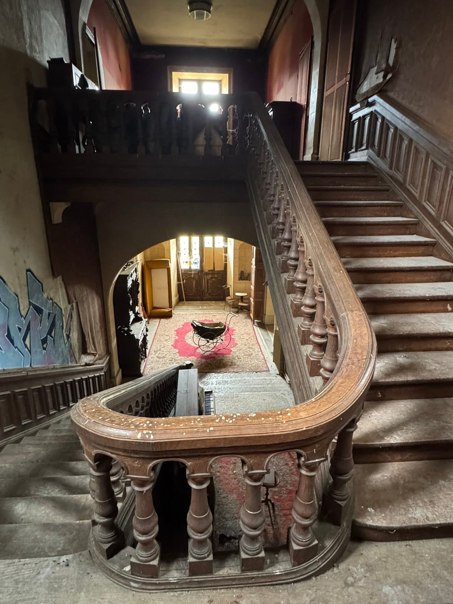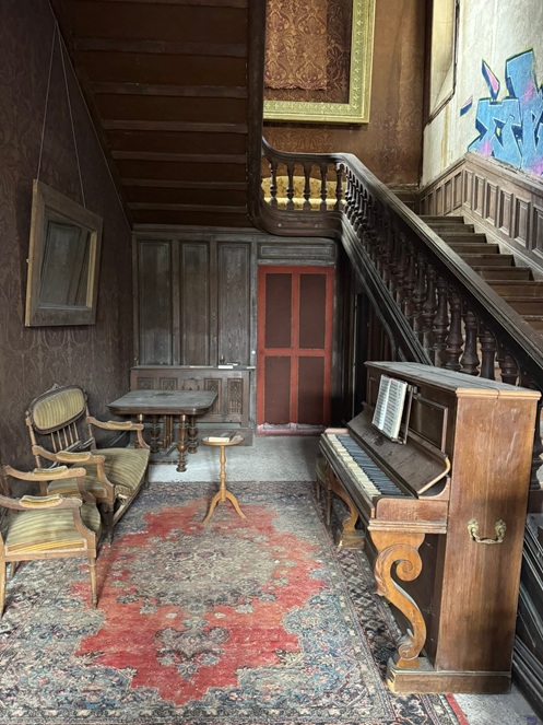 Die imposante Eingangshalle ist mit massivem Stein verkleidet und verfügt über einen beeindruckenden Mosaikboden, beherrscht von einer majestätischen Treppe aus massivem Eichenholz. Abgesehen von wenig Graffiti und einer zerrissener Tapete ist der Raum bemerkenswert gut erhalten. Es gibt kaum Vandalismus.