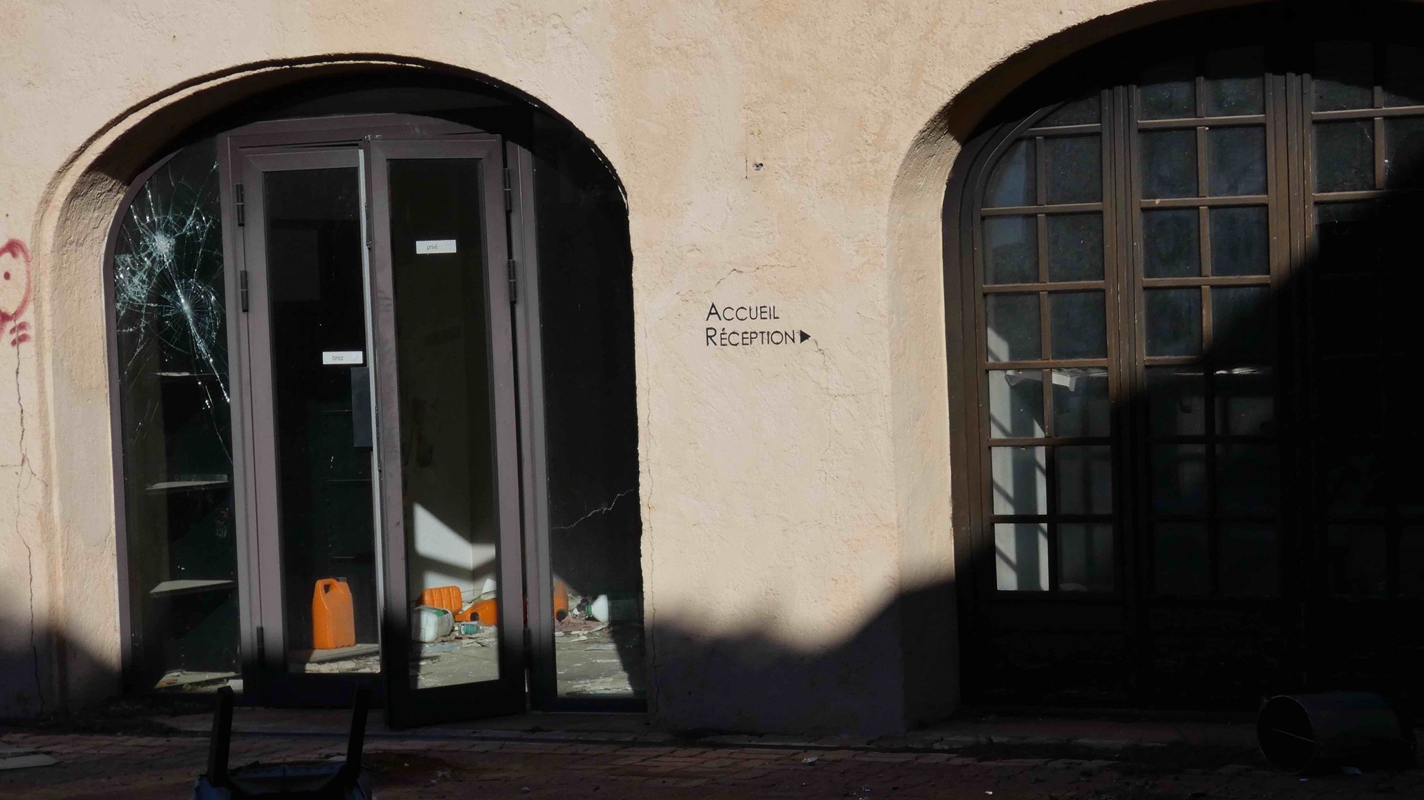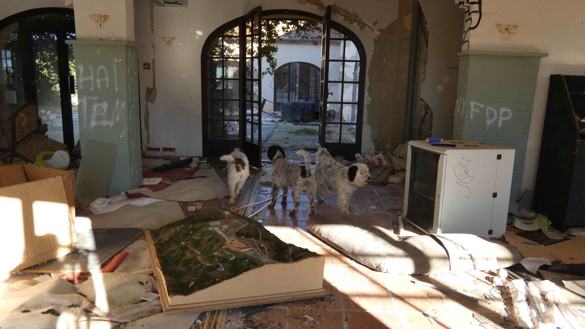 Eine Überwachungskamera mit Solarpanel hat durch unsere Bewegung ein akustisches Signal ausgelöst, aber wir denken nicht, dass eine Benachrichtigung gesendet wurde. Wir vermuten, das Château wurde aufgegeben. Wenn sich das in der Szene rumspricht, wird es überrannt werden und der Vandalismus nimmt zu.
